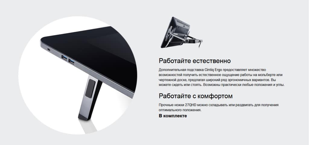 - Возможность регулировки подставки Встроенная подставка (5° без ног или 20° с ногами); дополнительная подставка Cintiq Ergo продается как аксессуар